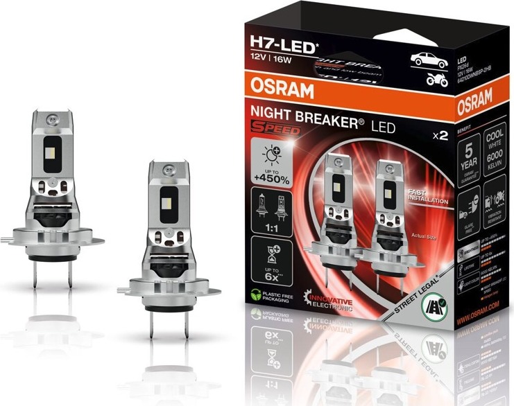 Pro všechny, kteří chtějí vidět více. Inovativní technologie umožňuje až o 450 % více jasu, což přispívá k výrazně lepšímu osvětlení vozovky. S dosvitem až 240 m při použití potkávacích světel může NIGHT BREAKER LED SPEED nejen zlepšit vidění a viditelnost řidiče, ale také zvýšit bezpečnost všech ostatních účastníků silničního provozu. Chladná bílá barva světla až 6000 K navíc dodává vozidlu moderní a současný vzhled. Nahraďte halogenky LED žárovkami. Řešení typu plug-and-play zajišťuje rychlou a snadnou instalaci a bezproblémovou přeměnu dálkových a potkávacích světel vozidla na nejmodernější LED technologii, protože design orientovaný na budoucnost je 1:1 kompatibilní a téměř identický s tradičními halogenovými žárovkami. Technologie, která udržuje oslnění pod kontrolou. Celá řada NIGHT BREAKER LED se vyznačuje tím, že tyto LED žárovky, i přes svůj vynikající světelný výkon, vytvářejí světelný kužel bez oslnění. Díky technologii osvětlení bez oslnění od společnosti OSRAM je oslnění protijedoucích vozidel sníženo až o 50 % ve srovnání s maximálními hodnotami povolenými zákonem. S jasnou a ostrou hranicí mezi světlem a tmou je to optimální volba pro každého, kdo si cení bezpečnosti a spolehlivosti na silnici. Udržitelná osvětlení. Ve srovnání s tradičními halogenovými žárovkami spotřebovává NIGHT BREAKER LED SPEED až o 60 % méně energie, což přispívá ke zlepšení palivové účinnosti. Její doba životnosti – až šestkrát delší – výrazně snižuje intervaly údržby a spotřebu materiálu, což vede k menší produkci odpadu. Produkt je dodáván v obalu bez plastů, čímž podporuje šetrné využívání zdrojů po celou dobu svého životního cyklu. Navrženo pro dlouhou životnost. Produkty OSRAM jsou inovativní a technologicky vysoce kvalitní výrobky, které jsou pečlivě testovány a podléhají přísnému dohledu systému zajištění kvality OSRAM. Proto OSRAM nabízí 5+1letou záruku na všechny retrofitní žárovky NIGHT BREAKER LED SPEED.OSRAM nabízí na všechny retrofitní žárovky NIGHT BREAKER LED SPEED záruku 5+1 roku.