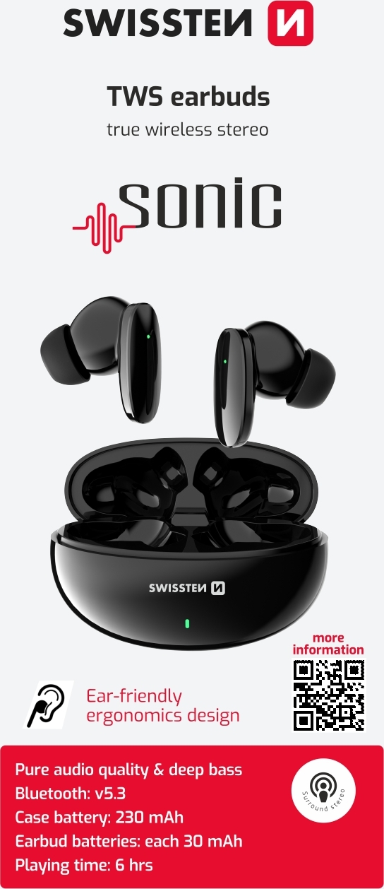 Elegantní bezdrátová TWS sluchátka Swissten Sonic, Bluetooth: 5.3, Frekvence: 20 - 20 KHz, Výdrž: 6 h., Hmotnost: 37 g, Kapacita baterie: 230 mAh, Bluetooth dosah: < 10 m. Baleno v blistru Swissten.