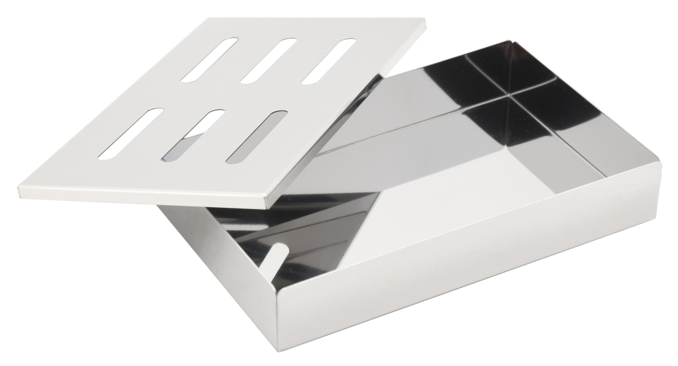 Box má rozměry 21 x 13 x 3,5 cm a je zhotoven z nerezové oceli, s perforacemi pro pozvolné uvolňování vůně z dřevěné štěpky.