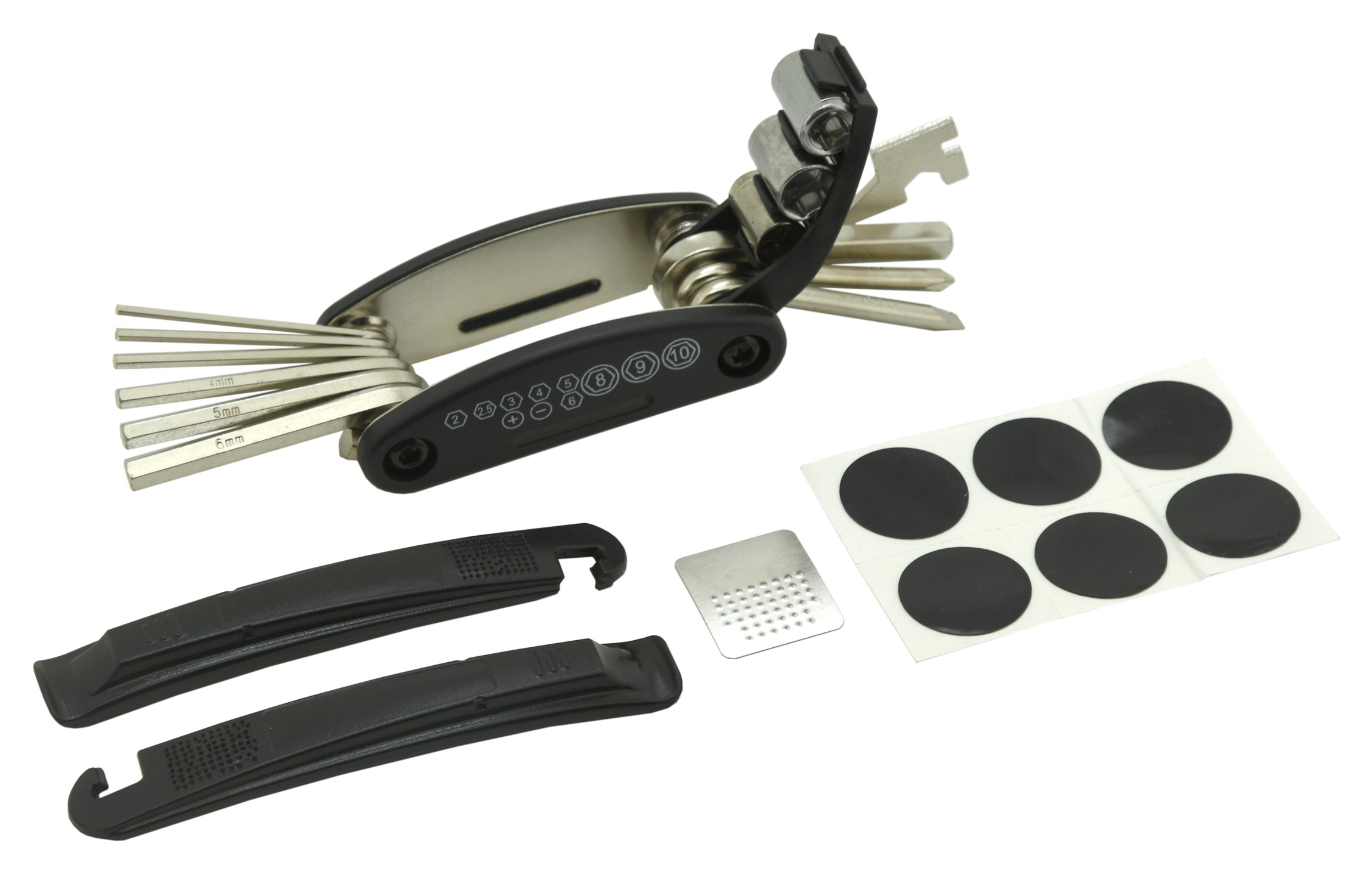 Multitool je složen z 6x imbusových klíčů (2/2,5/3/4/5/6 mm), křížového a plochého šroubováku, stranovým klíčem (8/10/15 mm a klíčem 14GE na výplet kol) a v neposlední řadě čtyřhranným šroubovákem spolu s HEX nástavci (8/9/10 mm).
