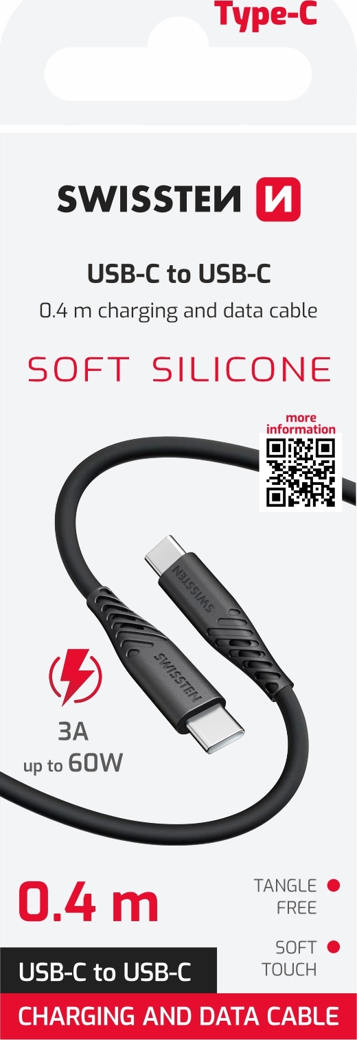 Ohebný, flexibilní a datový kabel SWISSTEN SOFT SILICONE USB-C / USB-C , Délka: 0,4m, Výkon: 60W, Proud: až 3A. Baleno v blistru SWISSTEN.