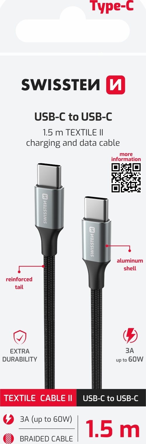 Swissten textilní kabel II s datovým přenosem, USB-C - USB-C, Délka: 1.5 metrů, Výkon: 60 Wattů, Proud v kabelu: 3 A, Rychlost přenosu dat: 480 Mb/s. Baleno v blistru Swissten.