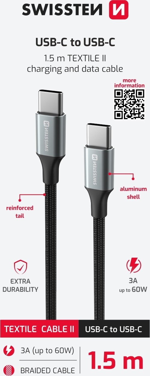 Parametry produktu DATOVÝ KABEL SWISSTEN TEXTILE II USB-C / USB-C 1,5 M ČERNÝ