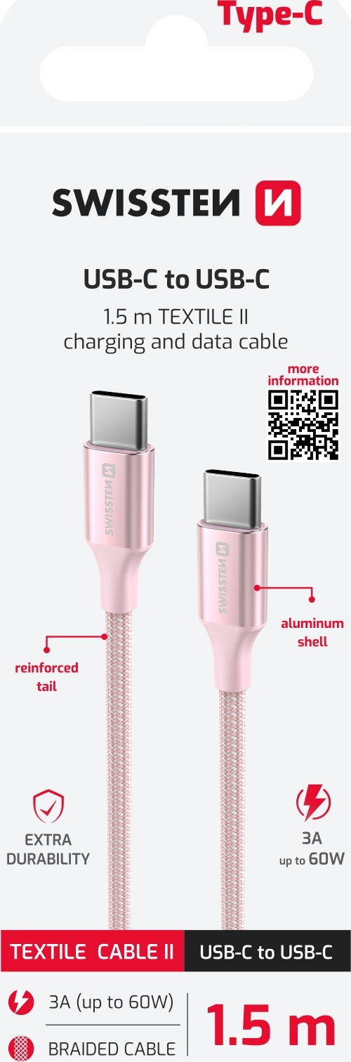Parametry produktu DATOVÝ KABEL SWISSTEN TEXTILE II USB-C / USB-C 1,5 M RŮŽOVÝ