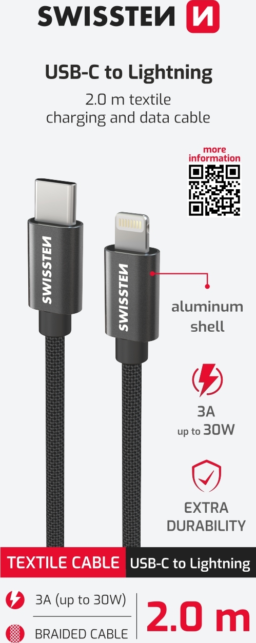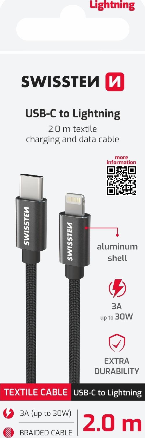 Parametry produktu DATOVÝ KABEL SWISSTEN TEXTILE USB-C / LIGHTNING 2,0 M ČERNÝ