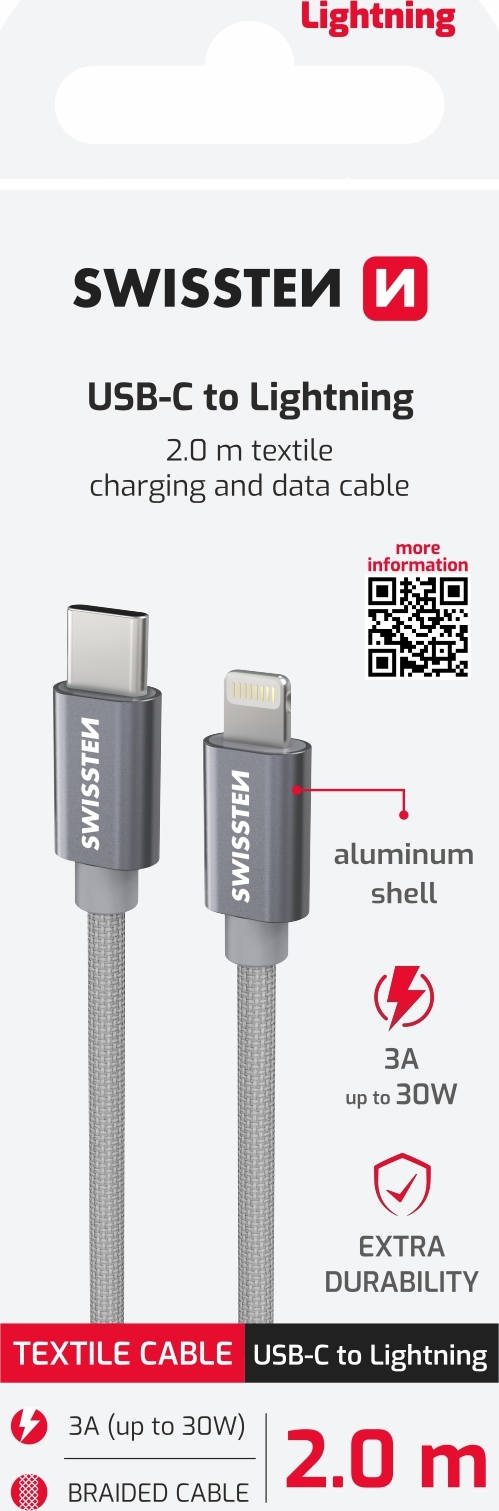 Parametry produktu DATOVÝ KABEL SWISSTEN TEXTILE USB-C / LIGHTNING 2,0 M STŘÍBRNÝ