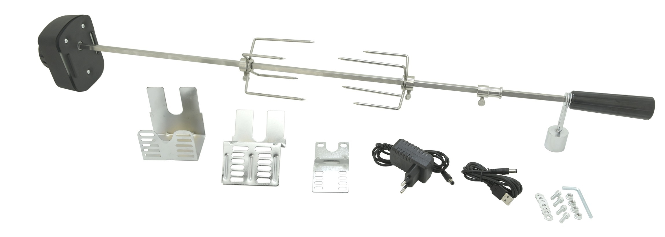 Motor disponuje rychlostí 3 otáčky za minutu, čímž zajišťuje rovnoměrné grilování kuřat, špízů a různých bloků masa, postupně ze všech stran. Motor lze napájet ze standardní zásuvky 230 V, nebo pomocí USB kabelu (5V) například z powerbanky.