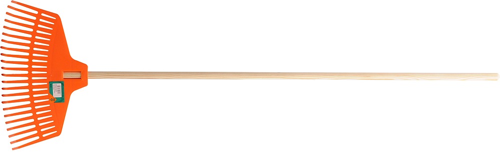 Lehký shrnovač listí vyrobený z odolného plastu a rukojetí z borovice.