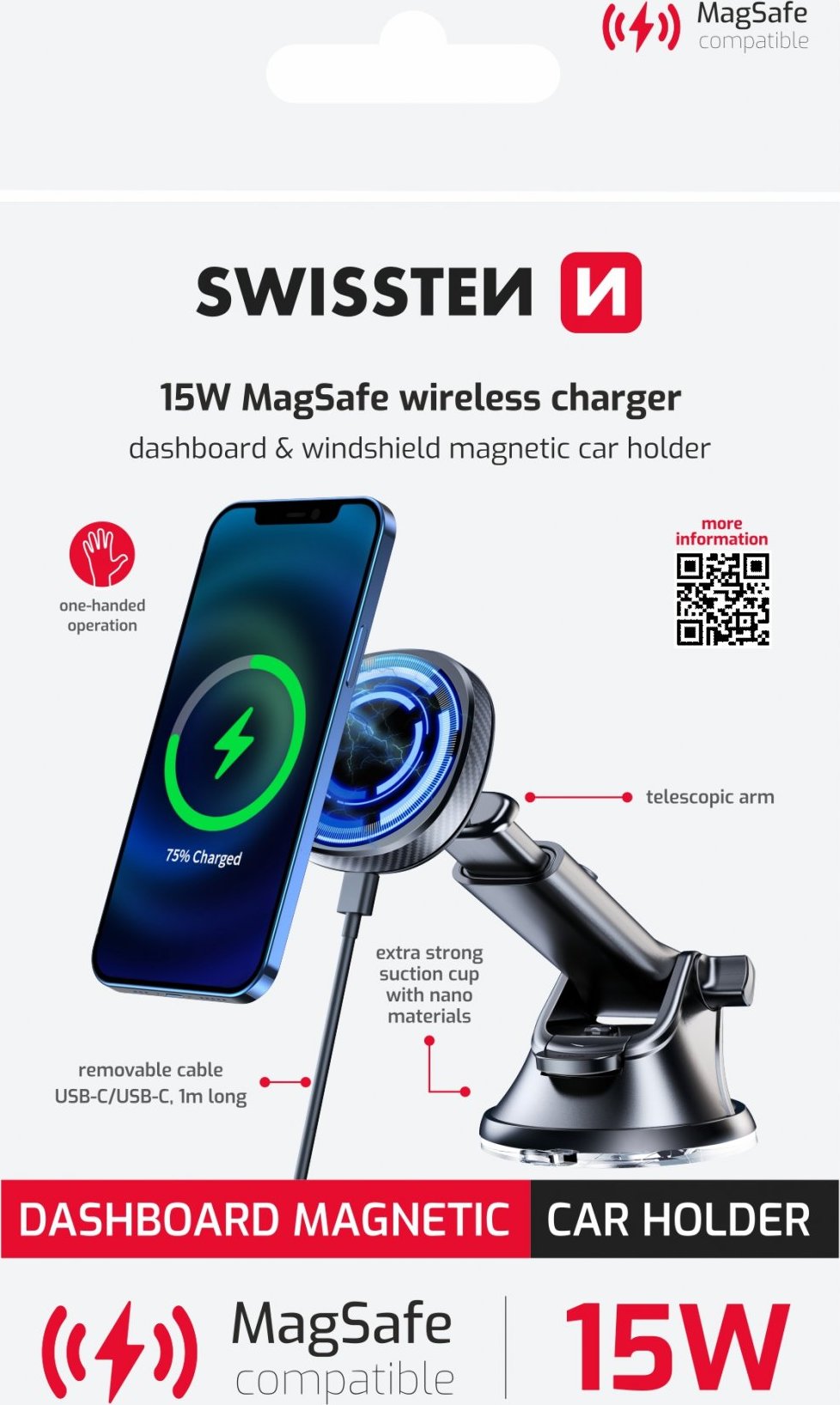 Parametry produktu MAGNETICKÝ DRŽÁK DO AUTA SWISSTEN S BEZDRÁTOVÝM NABÍJENÍM 15W DASHBOARD (MagSafe compatible)
