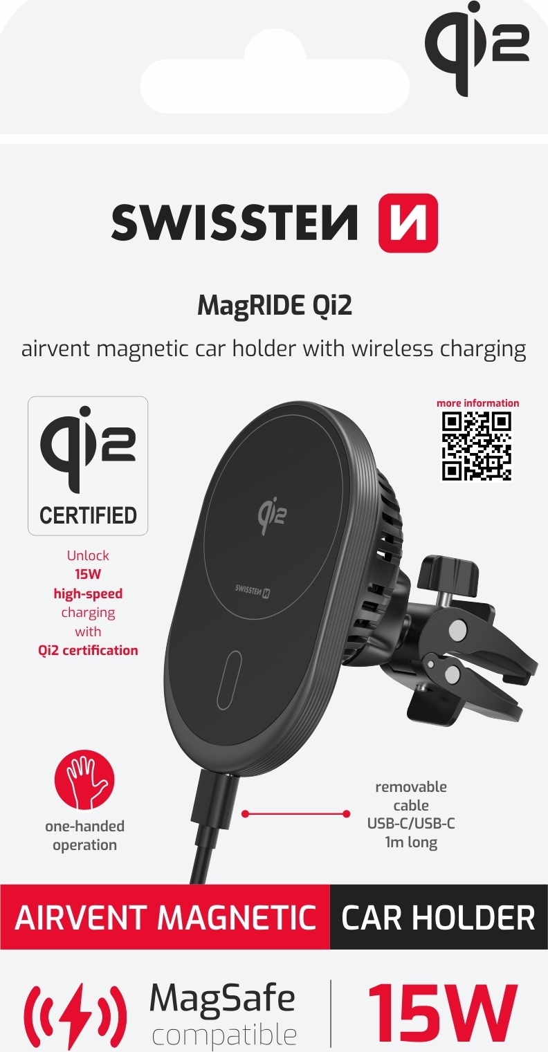 Parametry produktu MAGNETICKÝ DRŽÁK DO VENTILACE AUTA SWISSTEN MagRide S BEZDRÁTOVÝM NABÍJENÍM Qi2 15W (kompatibilní s MagSafe)