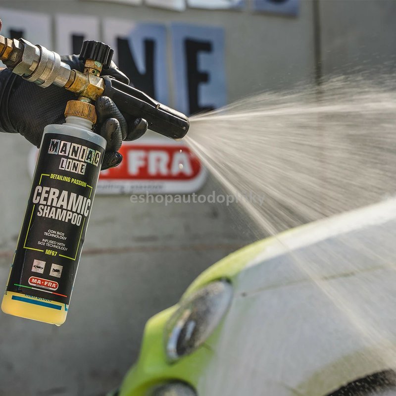 Nejprve proveďte předmytí pomocí našeho přípravku „MANIAC – předmytí pro pěnové pistole“ pro odstranění hrubých nečistot na povrchu, aby se předešlo poškrábání a usnadnil se další krok ručního mytí. Pro správné použití přípravku „MANIAC - keramický šampon“ doporučujeme používat metodu mytí se dvěma kbelíky. (jeden kbelík s roztokem šamponu/vody a druhý kbelík pouze s čistou vodou) a s mycí rukavicí z mikrovlákna, jako je například naše „Dvojitá rukavice – mikrovlákno“ nebo houbou/padem, jako je například naše „Houba z mikrovlákna“.
