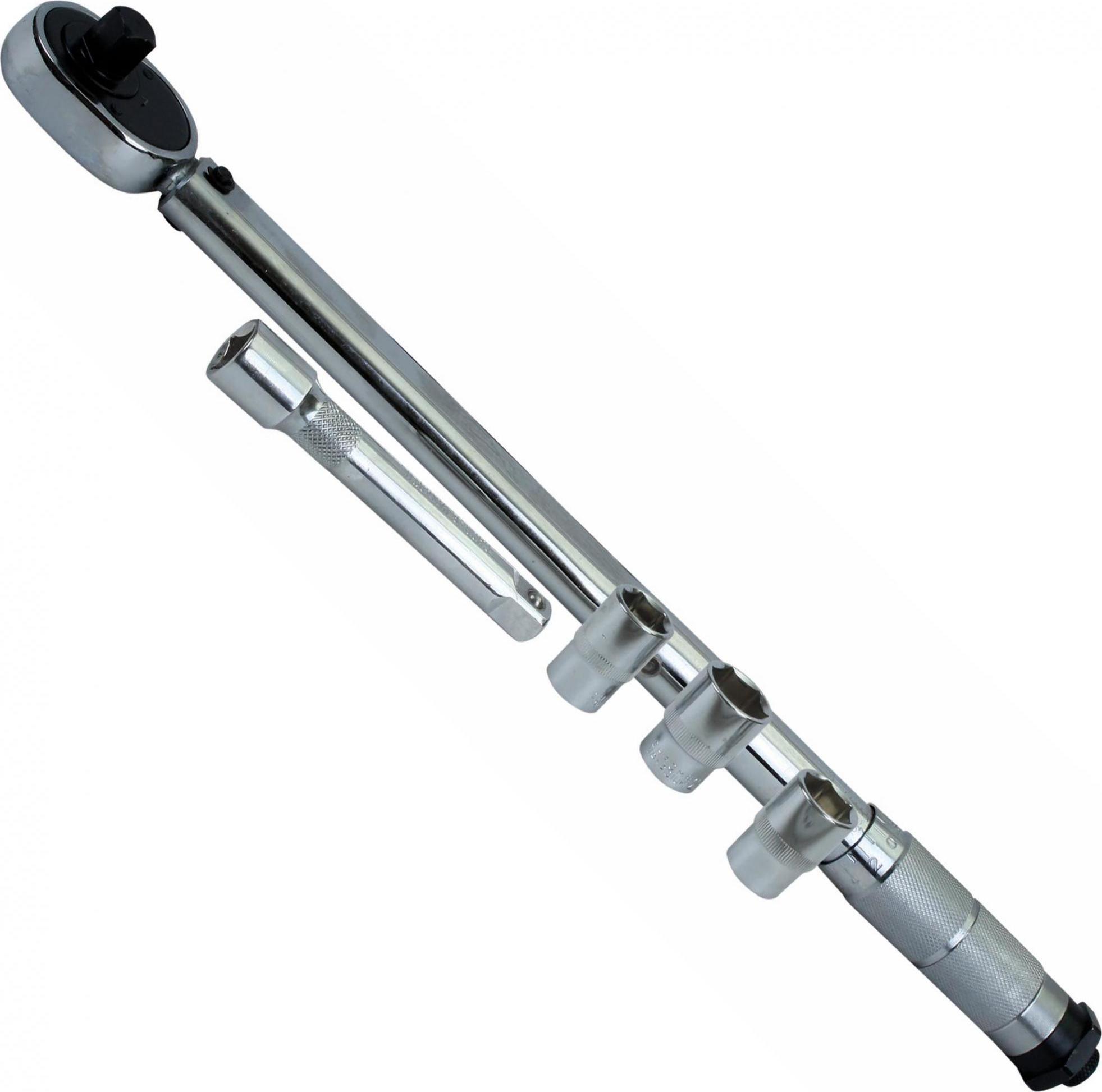 Nastavení konkrétní hodnoty kroutícího momentu dosáhnete otáčením vroubkované rukojeti. Tento momentový klíč byl kalibrován a testován před opuštěním z výroby s přesností na ± 4%. Rozsah nastavení utahovacího momentu 40-210Nm, materiál chrom-vanadová ocel, 1/2-palcový trn, v sadě jsou také nástavce 17/19/21mm.