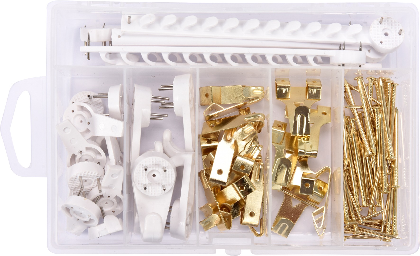 Sada 121 kusů háčků a příslušenství pro zavěšení obrazů.