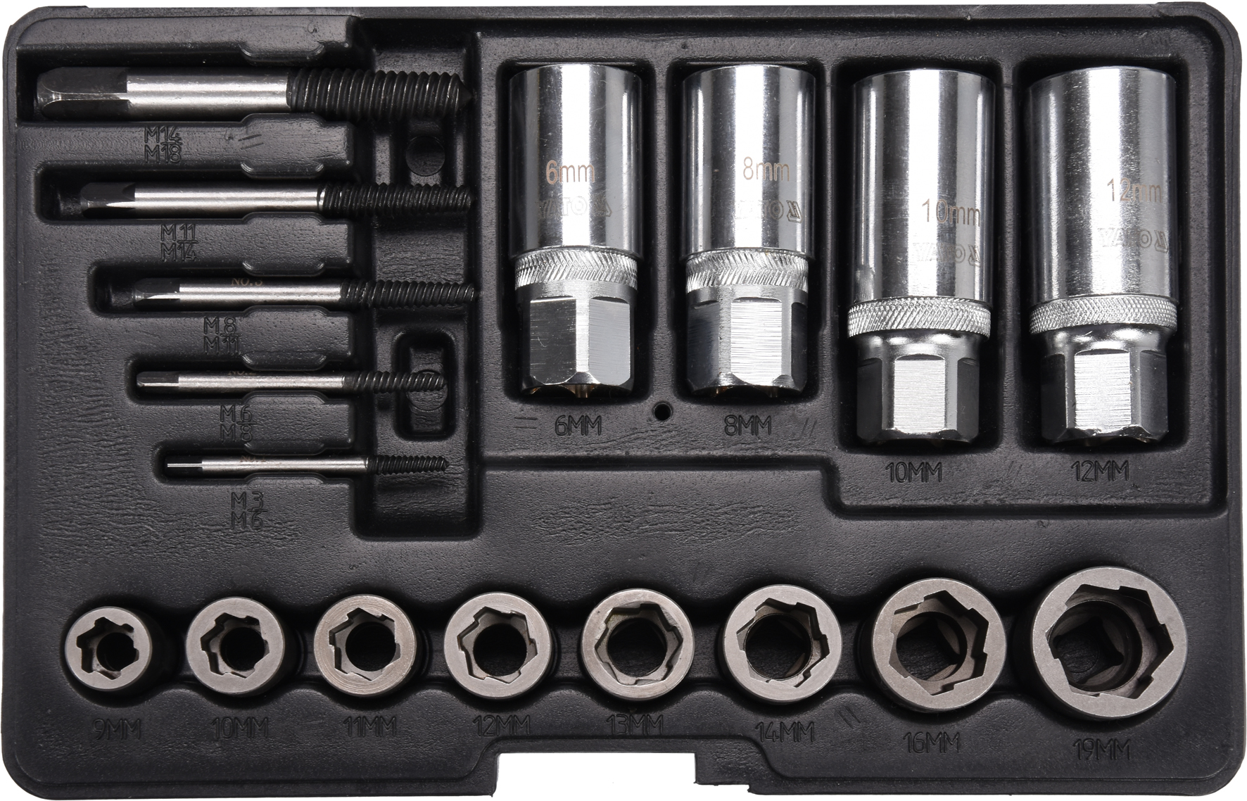 Univerzální 17dílná sada vytahováků šroubů a nástrčných klíčů. Doporučeno pro mechanické a automobilové služby.