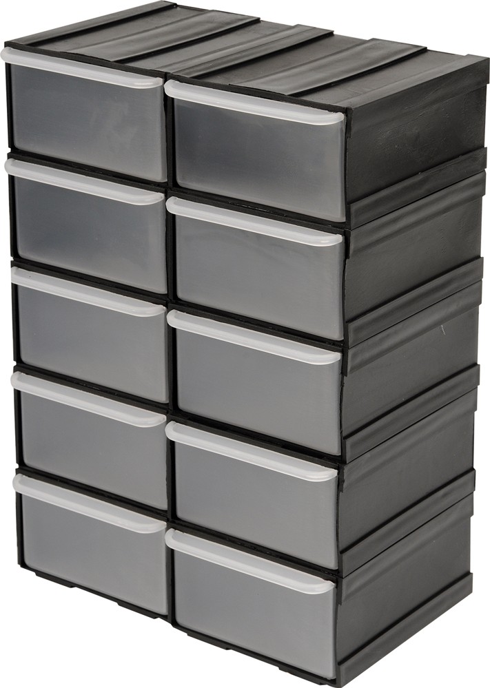 Dílenské zásuvky 22,5x15,5x10 cm. Určeno k uložení drobných předmětů, jako jsou drobné spojovací prvky, náhradní díly a nářadí. 10 zásuvek. Rozměry jednoho modulu: 7,8 cm (šířka) x 10 cm (hloubka) x 4,6 cm (výška). Užitečné doma, v garáži, dílně, skladu atd.