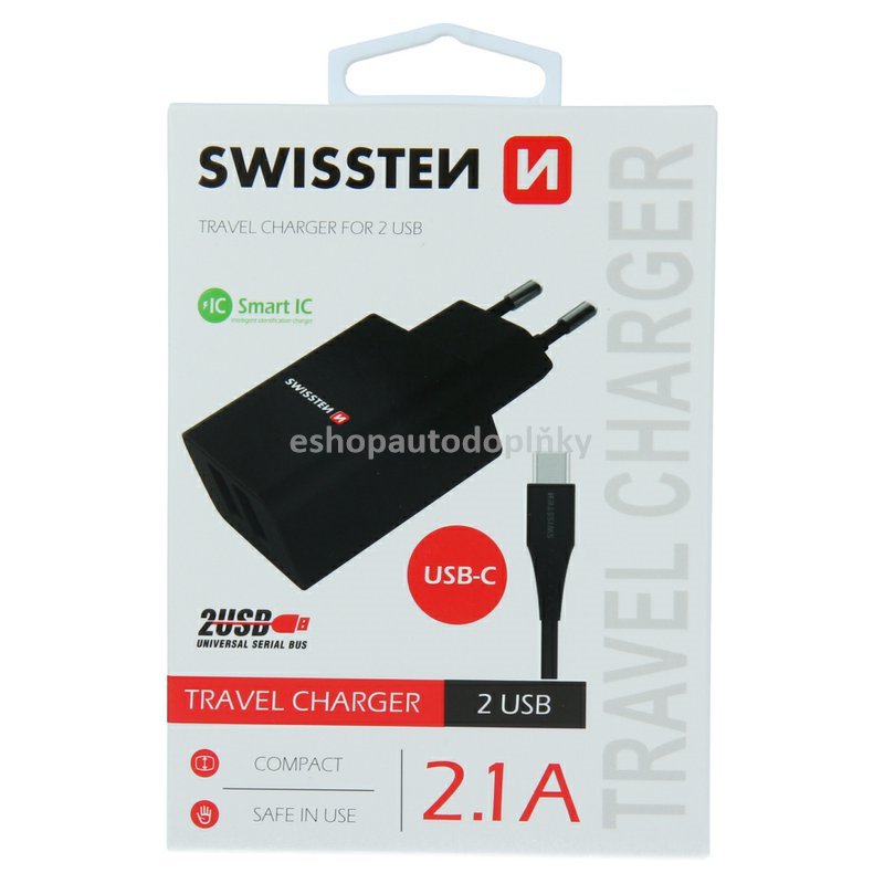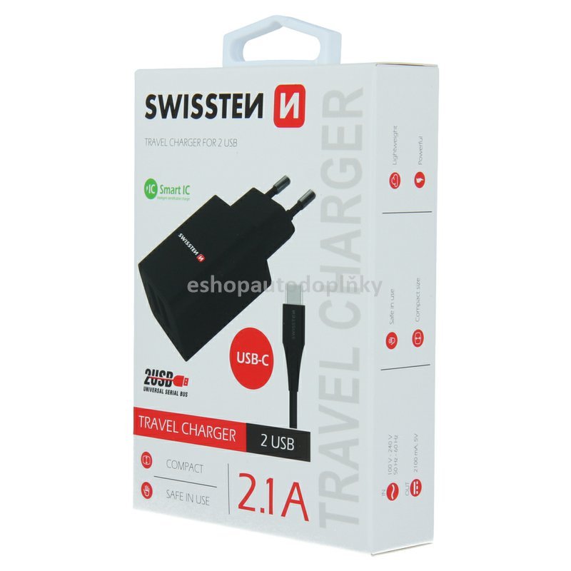Swissten 22054000 Síťový adaptér SMART IC 2x USB 2,1A power+kabel USB/type C 1,2m černý