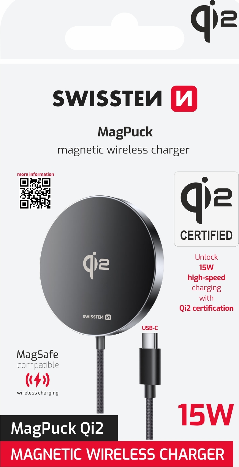 SWISSTEN MagPuck Qi2 bezdrátová nabíječka, Výkon až 15 W, MagSafe kompatibilní, Podpora iPhone 12+, Samsung S23–S25, AirPods, Konektor USB-C 1,5 m, Hmotnost 62 g, Rozměry 59 × 7 mm. Baleno v blistru Swissten.