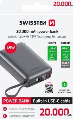 Powerbanka Swissten 20000 mAh s integrovaným kabelem USB-C, Výstupní porty: USB-A + USB-C, Max. výkon 45W, Váha: 334 g, Typ baterie: Li-Polymer, Malé rozměry: (10.2 x 7.1 x 2.9 cm). Baleno v blistru Swissten.