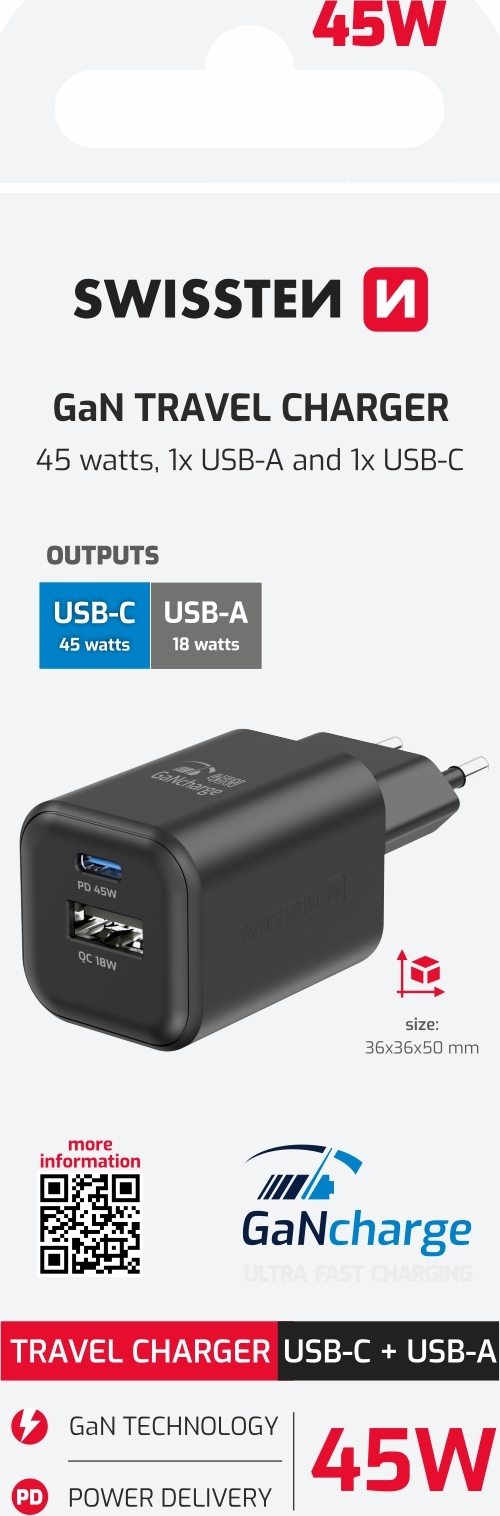 Parametry produktu SWISSTEN SÍŤOVÝ ADAPTÉR GaN 1x USB-C 45W PD + 1x USB-A 18W QC ČERNÝ