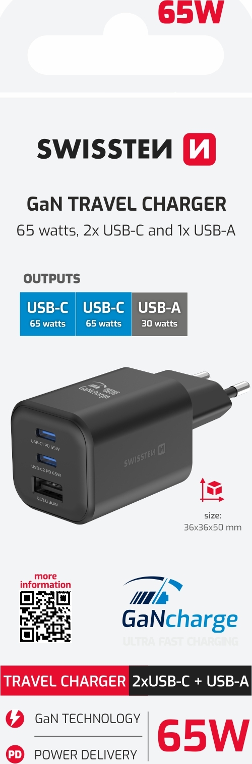 Nabíječka Swissten, Max. výkon 65 Wattů, 2x USB-C + 1x USB-A, GaN technologie - efektivní nabíjení bez přehřívání, Ochrana proti zkratování, přepětí, přetížení nabíjení a vysoké teplotě, Malé rozměry. Baleno v blistru Swissten.