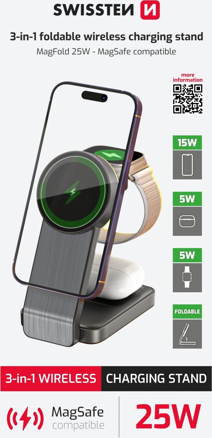 Parametry produktu SWISSTEN SKLÁDACÍ BEZDRÁTOVÁ NABÍJEČKA MAGFOLD 3v1 25W ČERNÁ (kompatibilní s MagSafe)