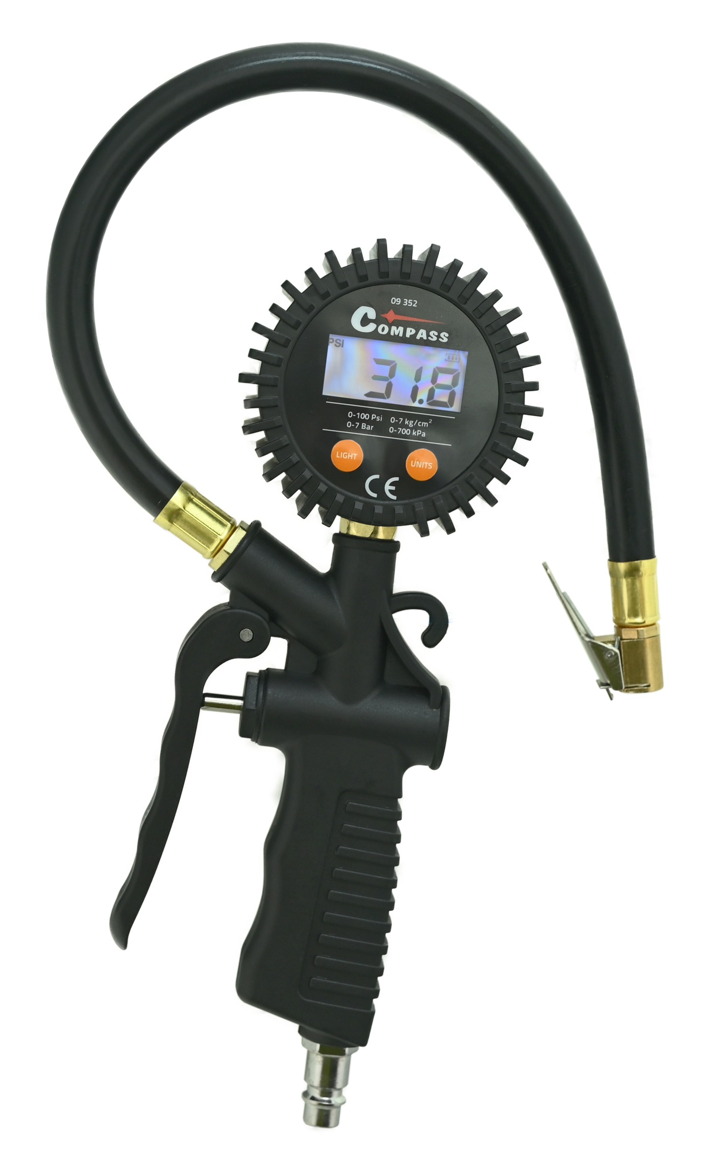 Vzduchová pistole s digitálním manometrem pro huštění pneumatik vozidel.