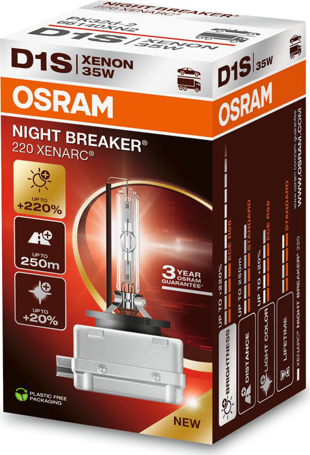 XENARC NIGHT BREAKER 220 je nejjasnější xenonové výbojkové světlo OSRAM. Toto výkonné světlo s účinnou xenonovou technologií zajišťuje lepší viditelnost na silnici: až o 220 % vyšší jas ve srovnání s minimální zákonnou normou. Více světla umožňuje vidět dále, a tudíž i dříve reagovat. K tomu se přidává až 250 metrů dlouhý kužel světla a až o 20 % bělejší světlo pro modernější vzhled (ve srovnání s minimální zákonnou normou). Objevte čistý výkon XENARC NIGHT BREAKER 220 - nejvýkonnějšího xenonového světla od společnosti OSRAM, které je k dispozici ve verzích D1S, D2S, D3S a D4S. Upozornění: Výměnu lampy XENARC doporučujeme provádět odborně a ve dvojici.