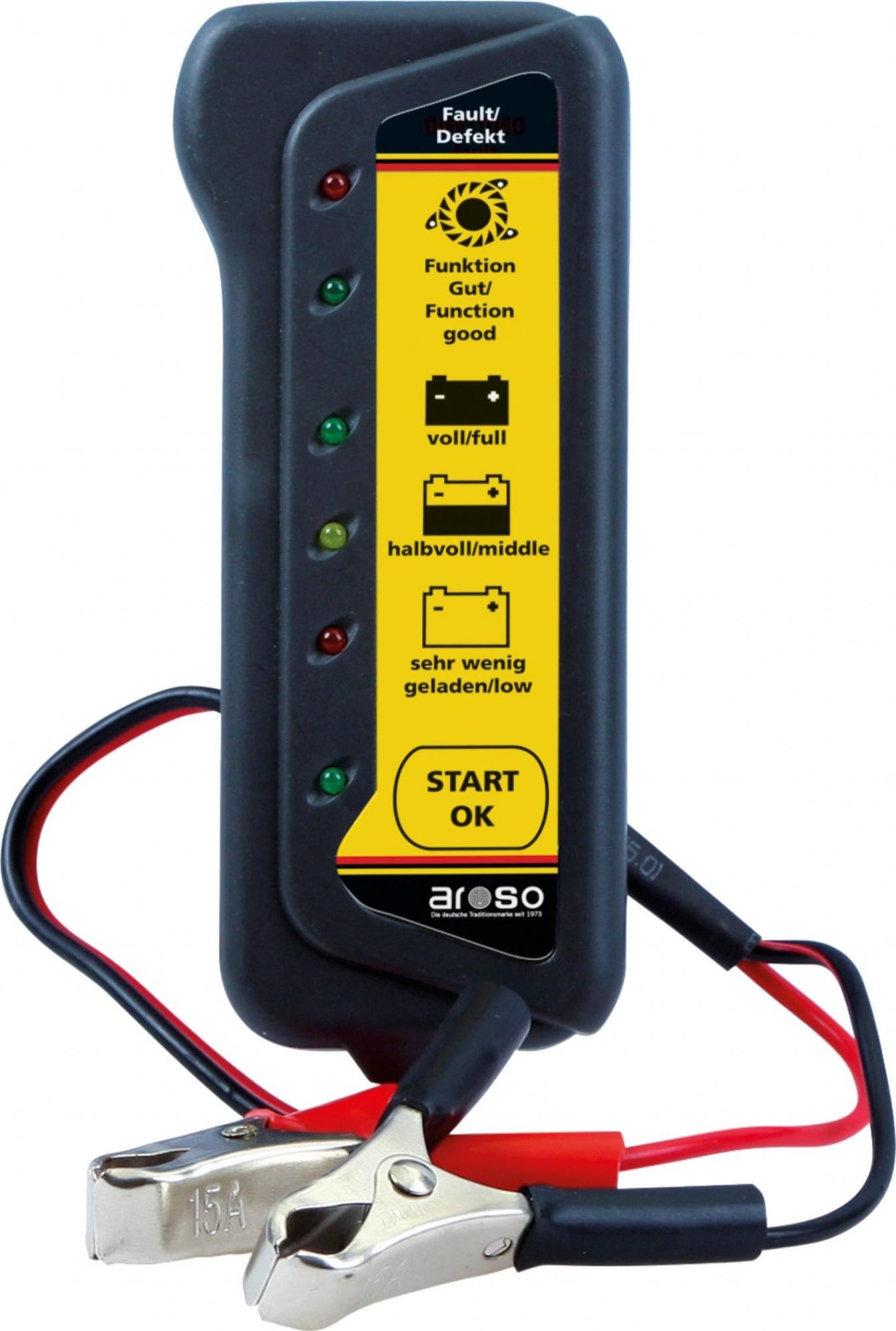 Zkoušečka od renomované německé značky Aroso s tradicí již od roku 1973 na západoevropských trzích důkladně otestuje stav autobaterie 12V ve vozidle a také funkci dobíjení alternátoru. Pomocí podrobně popsaných sérií testů s vypnutými i zapnutými elektrickými spotřebiči ve vozidle lze pomocí LED diod ihned indikovat stav nabití autobaterie i kvalitu dobíjení alternátoru.